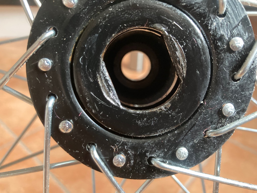 Rechts mit eckigem Flansch auf der Achse, links läuft das Rad frei auf den Lagern
